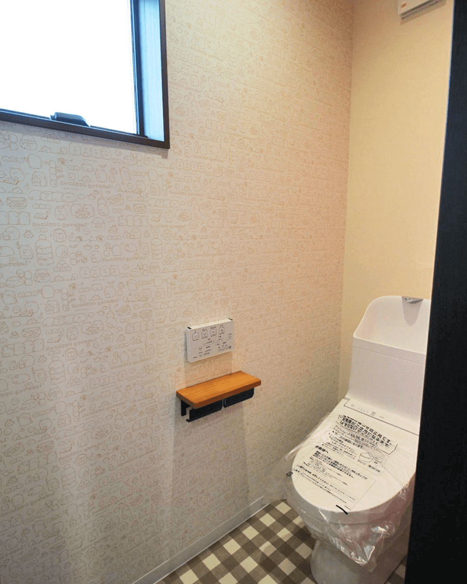 2階(写真右)のトイレは壁紙や床の色を小学生のお子様が選ばれました!