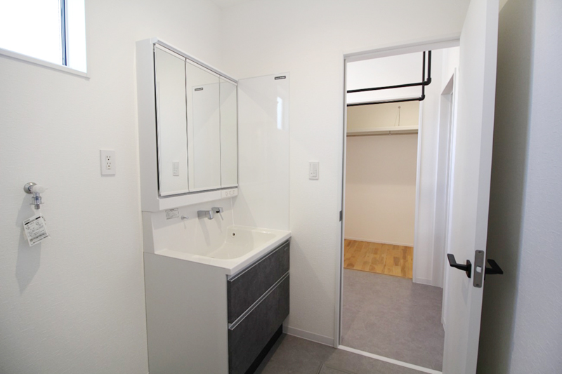 バスルームからランドリールーム、さらにその先のファミリークローゼットまでが一直線につながる間取りは、まさに家事ラク導線の理想形。