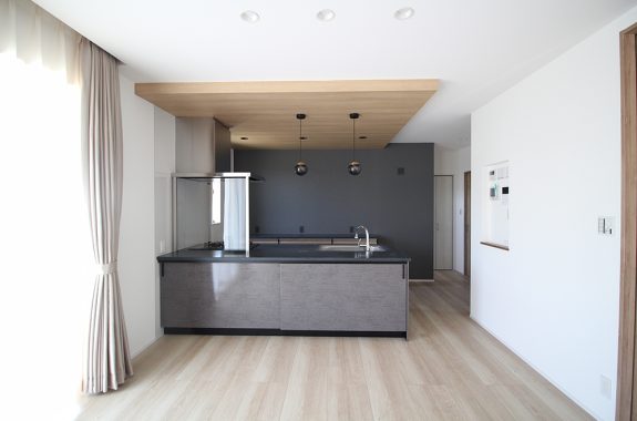 家の中心には、ゆとりあるリビングダイニングとキッチンを配置。空間のつながりを大切にしながら、キッチンは人気のフラットタイプを採用。ダイニング側・キッチン側のどちらからも手が届きやすく、使い勝手の良さがポイントです。キッチンのグレーの面材と木目のフローリングとの組み合わせが美しく、インテリアとしても洗練された印象に。